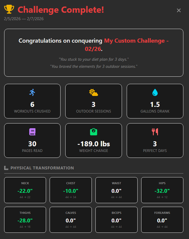 If you tracked your measurements, we calculate exactly how many inches you lost (or gained) in every spot. We also calculate the total gallons of water you drank, the pages you read, and—if you were brave enough to face the Buffalo winter—we even award you a badge for your Outdoor Sessions.